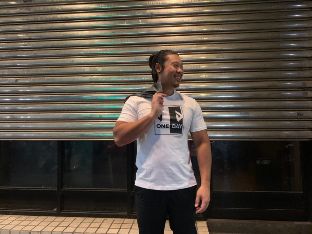 營業時間,Combo專業的正裝保持日系調酒師形象,營業結束,換上DAYONE日以繼夜Tee,帶出健身成果的好身型,也提醒自己保持初心面對日復一日的店裡大小事,用笑容迎接明日再出發。